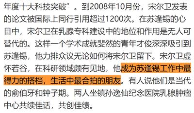 我还是尊重苏教授和宋院士两位杏林高手的,毕竟他们救人无数。可惜的事,这对工作中最得力的搭档,生活中最合拍的朋友在子侄的工作中也互相照顾。