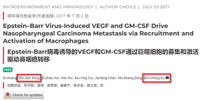 然后苏士成先生在2017年作为通信作者,发表了一篇文章《Epstein–Barr Virus-Induced VEGF and GM-CSF Drive Nasopharyngeal Carcinoma Metastasis via Recruitment and Activation of Macrophages | Cancer Research | American Association for Cancer Research --- EB 病毒诱导的 VEGF 和 GM-CSF 通过巨噬细胞的募集和激活驱动鼻咽癌转移 癌症研究|美国癌症研究协会[9]》,这篇文章的第二作者Song shi jian,偏偏又姓宋。