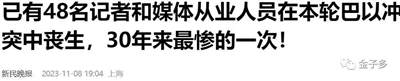 如今,在这轮巴以冲突中已有48名记者和媒体人员丧生,99名联合国工作人员遇难。