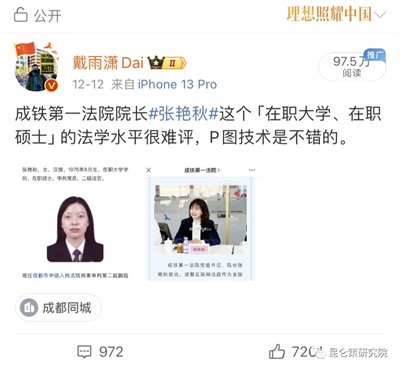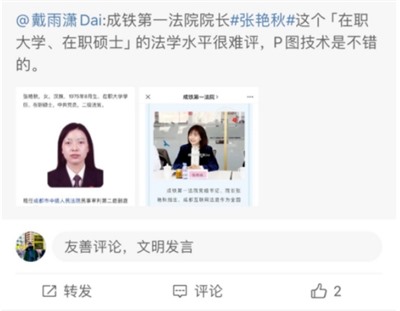 成都地铁诬告案宣判之后,我出于好奇查了查做出判决的成铁第一法院的领导是何方神圣,然后昨天顺手发了条微博展现成铁一院院长张艳秋的风采。用的两张图都是合法获取的公开信息。