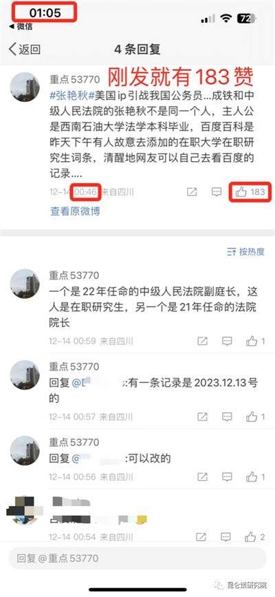 然后我往前翻提醒翻到了一条四川IP发布的异常评论。这条评论在不到20分钟的时间里得到了180多个赞。
