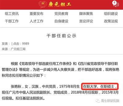 2020年1月9日,广元市委组织部官网发布《干部任前公示》,其中写着张艳秋“1975年8月生,在职大学、在职硕士”,“现任广元市中级人民法院副院长,拟任基层法院院长”。