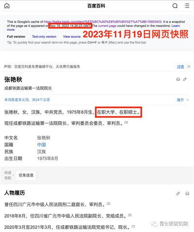 百度百科关于张艳秋院长的词条昨天是被编辑过,但并不是改学历。下图是上个月(2023年11月19日)百度词条的网页快照,里面清楚地写着“在职大学学历、在职硕士”。学历的描述早就在张艳秋院长的词条里了。
