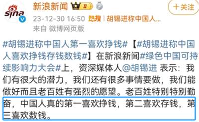 在#绿色中国可持续影响力大会#上,胡锡进先生表示,“我们有很大的潜力,我们还有很多事情要做,我们能做好而且老百姓有强烈的愿望。老百姓特别特别勤奋,中国人真的第一喜欢挣钱,第二喜欢存钱,第三喜欢数钱”。坦白说,这说法我不反对,但是,我很不喜欢,所以,我不揣冒昧,向胡锡进先生请教,还望胡锡进先生拨冗雅正。