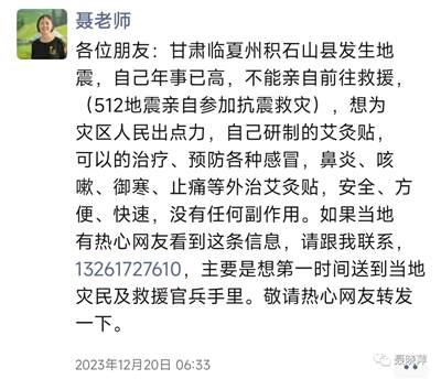 一方有难,八方支援,天灾无情人间有爱。聂老中医率中医团队爱心人士把古方艾灸贴送到甘肃省积石山地震灾区,为灾区人民健康保驾护航。