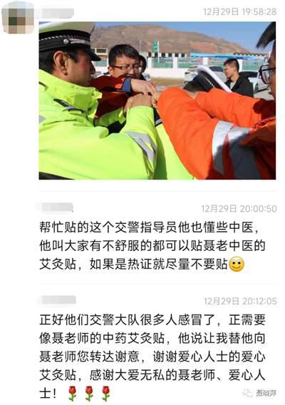适逢隆冬时节,灾民取暖、保暖不便,极易发生感冒等症状。想到这种情况,聂晓萍老师彻夜难眠,立刻联系艾灸贴的厂家赶制艾灸贴,并通过朋友圈及全国的红色网友,寻找当地可以接收并发放艾灸贴的网友: