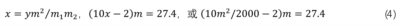 但是美国工人维持自己生活水平的另一条道路就提高自己的劳动力价值,也就是改变那个作为美国劳动力价值占产出比的x值,以便使得10x-2吨玉米的剩余换成服装还是27.4件。为此再设m为国际贸易比,m_1为美国国内交换比,m_2和y分别为墨西哥国内交换比和劳动力价值占产出比,并由公式 (3) 得知,维持生活水平的贸易比和劳动力价值是由以下方程组决定的: