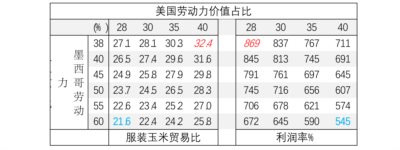 利润率平均化首先会改变服装与玉米的比价,同时也会改变美国和墨西哥劳动力价值占比。这两者计算的核心原则仍然是贸易比是国际的,成本是按照国内比计算的。