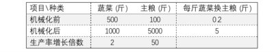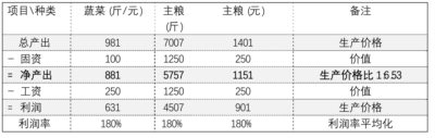 有了机械化以后,假如1000斤的蔬菜与5000斤的主粮都需要花费一天的社会必要劳动时间,但是主粮劳动生产率的增长比蔬菜的要大的多 (见表二) ,原来同等的利润率就不可维持。