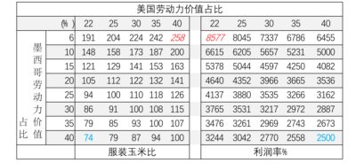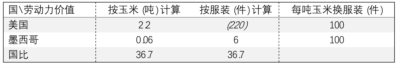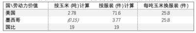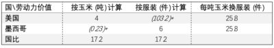 表十七、墨西哥服装生产率增长10倍后贸易中所含实物劳动力价值下限