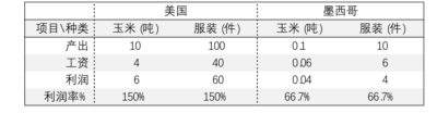 服装厂的老板把墨西哥生产的服装出口到美国,那么生产了1000件服装换回了10吨玉米,只是耗费了10个墨西哥服装工人一天的劳动。他们劳动力价值的下限按玉米算相当于 (0.06×10=) 0.6吨玉米,因而利润是 (10-0.6=) 9.4吨,比没有贸易情况下10个农工生产1吨玉米产生的 (10×0.04=) 0.4吨利润多出整整9吨!