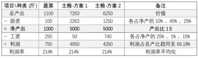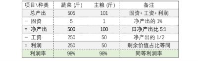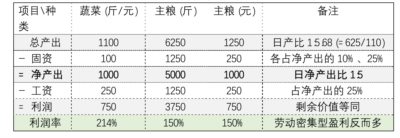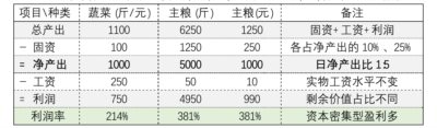 那么蔬菜的利润 =1000净产出-250工资=750斤,利润率 =750/(250+100) = 214.3%;而主粮的利润 =5000净产出-1250工资=3750斤,利润率 =3750/(1250+1250) = 150%,远远低于劳动密集型的利润率 (见表四) 。