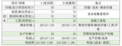 这是个莫名其妙的生产而非贸易的模型。既然生产的是同样产品,国内就只能有一个单一的价值,国际市场上也基本只有单一的价格,因此这里所谓的生产价格表示的其实是产量的差异,同时也是价值的差异。