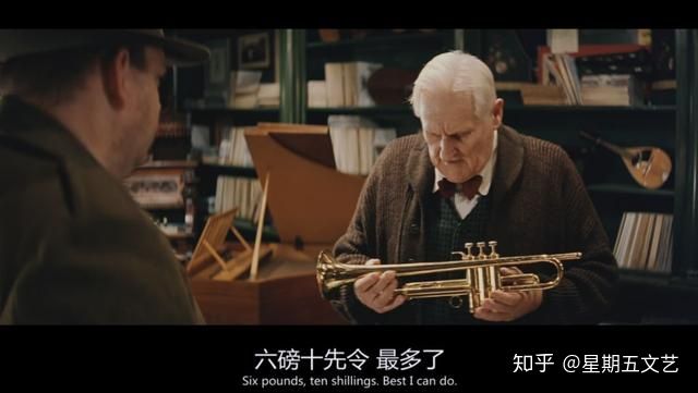 我们来看“爵士乐”。创作者的情感在那个小号手船外的戏份上展现无遗。电影开篇就演出了一种悲剧色彩——他(小号手)生活窘迫、要卖掉自己最爱、最珍贵的那个康恩牌小号,而这个小号在商人眼里,只不过值六英镑(二十五美元)。这些数字和情节足以象征化地表现出创作者对“传统爵士乐”没落的伤感。