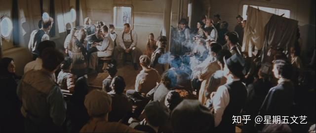 而整部电影形成的船上的另一大对比便是:豪华舱的歌舞升平与三等舱、底舱的脏乱闹腾...