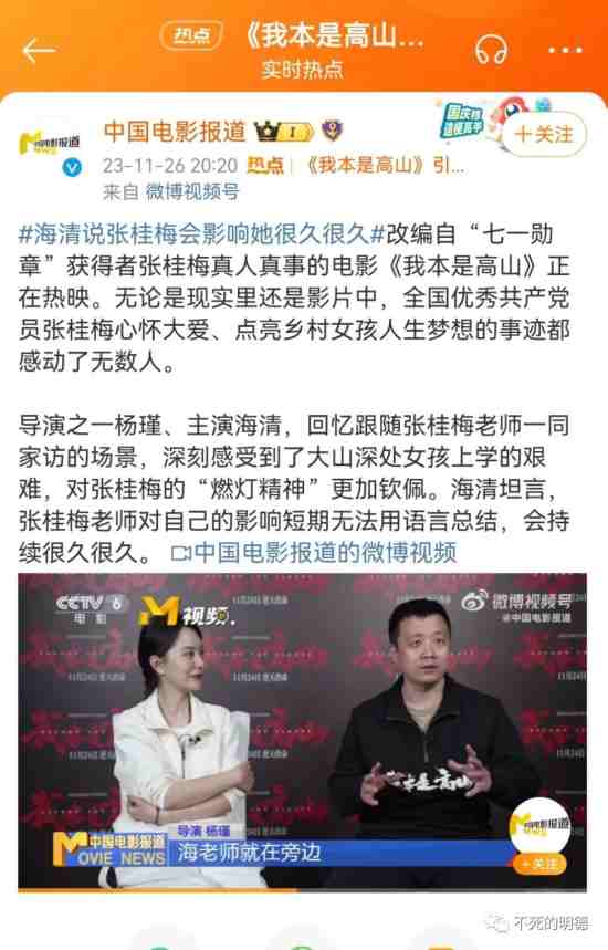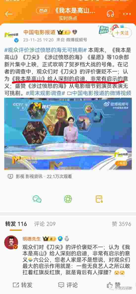 让我诧异的是,@中国电影报道 作为一家有着官方背景的机构,非但不深入群众,与人民大众一道探究《我本是高山》被广泛批评的深层次原因,反而一而再、再而三地为这部电影站台,无视群众的批评声,铁了心地推介,让我们不禁怀疑:你们的小编们,到底还有没有政治敏感性?还要不要跟人民群众站在一起?