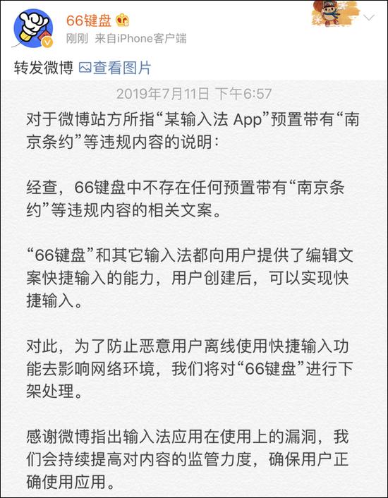 @66键盘 转发社区公告,表示APP中并不存在微博站方所称的带有“南京条约”等违规内容的相关文案,可能是某拥护创建的快捷输入。
