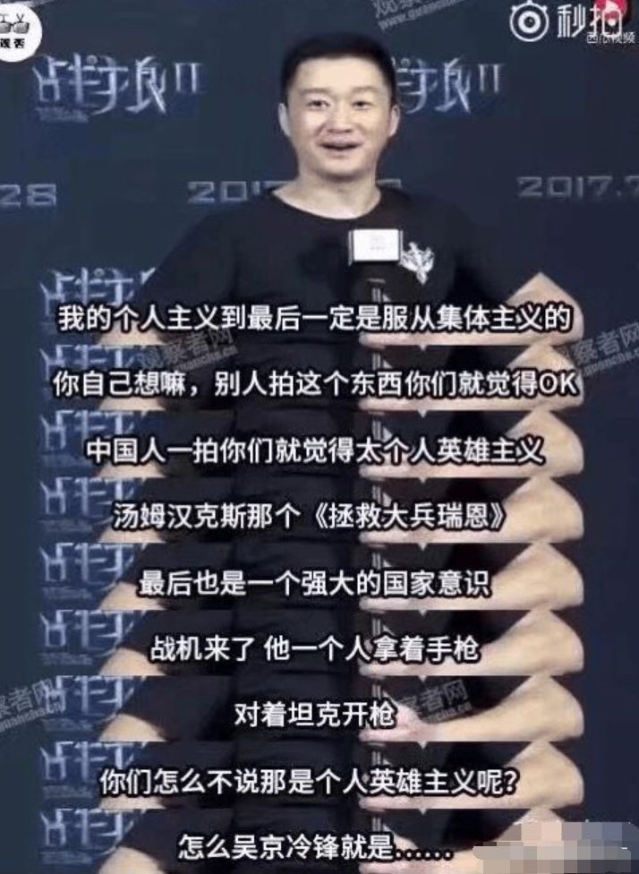 实际上,人家从来没有主动讲过“爱国”,都是你们给他扣的帽子。自从《战狼2》创造了票房纪录,有一群人就得了战狼PTSD,听到战狼就以为是民族主义、爱国主义,其实根本不是这样,如果你真的好好看过战狼2,应当会发现,这分明是一部“国际主义”的电影,高度颂扬了热爱生命、热爱人民的国际主义者。