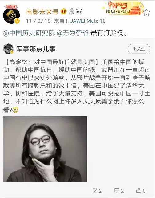 早些时候,网络大V高某松曾高调公开宣称“对中国最好的就是美国”,结果惨遭众网友打脸,说实话,我对网友对高某松先生的冷嘲热讽是持保留意见的,隔行如隔山,高某松先生毕竟是搞音乐的,既不擅长历史更对政治一知半解,一时嘴快说错点什么并非什么大不了的事,再说了,谁能保证一辈子不说错话呢?