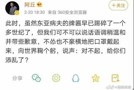 可以说,全世界对中国抗疫表现不满的并不多,而公知则是这些为数不多的奇葩中的代表。如某主持人前几天就曾大言不惭的说“(我们可不可以)向世界鞠个躬,说声:对不起,给你们添乱了?”