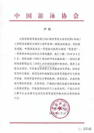今日,孙杨被禁赛的新闻被发布上网后,由于新闻中没有任何其它说明,引发广大网友的普遍关注。中国泳协倒没有像某社一样,而是公开进行了表态: