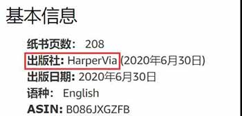 根据亚马逊网站提供的信息,出版社为美国的Harper Via。Harper Via是Harper Collins(哈珀柯林斯)出版集团旗下的、专门翻译文学作品的出版商。Harper Collins的官方网站上也提供了这本书的预售信息: