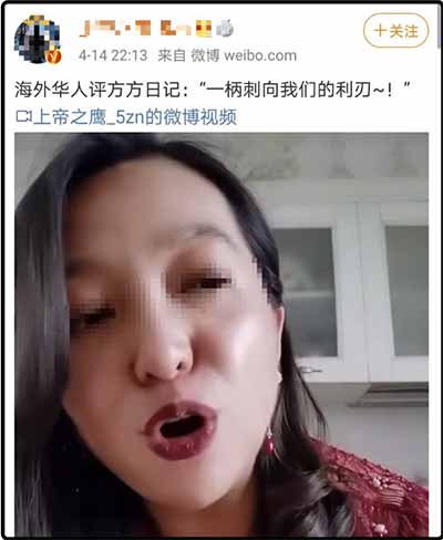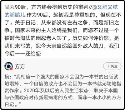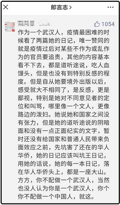 而日记此时出版西方,无疑是具有政治性的,因为西方正在找寻各种可利用的资源,将全球疫情的责任甩给中国。为了和所谓的“中国源头论”、“中国有罪论”、“中国隐瞒论”相抗衡,中国驻外大使、中国外交发言人以及无数的华人华侨和留学生亦是非常努力,可方方此时将日记出版海外,无疑是往自己的民族和国家身上插了一刀。