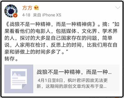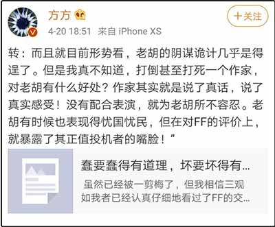 4月20日,方方再度带着极重的“旧社会气息”出现在微博,借他人之文发文挖苦:这都是胡锡进的阴谋诡计,他要打倒甚至打死一个作家,胡锡进对我方方的批评,说明他是一个投机者。