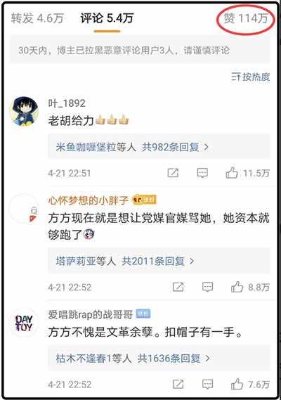 胡先生这一弹可谓巨大,算是说出了广大网友们的心声,于是相关内容迅速被全网疯传,短短不到一天,惹众怒的方方就被网友们骂上了热搜第一名,而胡总编怒斥方方的微博,点赞量也迅速破百万,并且仍在攀升。须知,单条微博点赞破百万是非常罕见的,通常是国庆阅兵这种“重特大正面新闻”才能达到的,可见方方引起的愤怒不容小觑。