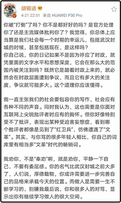 回应方方言论的有人民日报旗下《环球时报》社的总编辑胡锡进。尽管此前胡总编多次公开声称“社会要包容方方”,但他并不支持方方造谣带气氛的言论,显然被思想极端的方方认为是对自己的攻击与挑战,于是方方先后多次对其展开了毒辣的言语攻击。