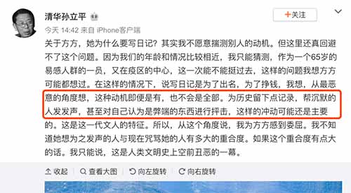 无论如何,力挺方方的“幸运儿”,是一个长长的名单,为免得罪人过多,余涅就不再这里一一罗列了,只提今天新增加的一位——清华大学孙立平教授。