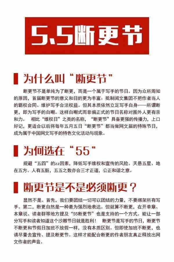 这的确够让人暴跳如雷,怎么自己孕育的作品还不是自己的了呢?于是,55断更节应运而生,这是一个为了抵制阅文的霸权合同,维护写手合法权益的节日。而它恰好也撞上了马克思——那个揭示了资本剥削秘密的人的诞辰。