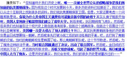 视频开篇,视频中的人说道:“我们看到的历史是真实的吗?它是被经过了一些修改的”。可能为了还原所谓的“真实的历史”,此人开始“举例说明”,先说中华民族是个热爱和平的民族,这些自然是没有问题的,不过还没说两句呢,味道就变了,特别是说到抗美援朝的时候,简直就是由着性子信口胡吣。