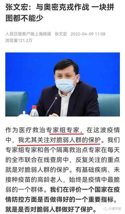 4月9日那一次,张文宏亲自上阵撰写文章,称赞自己尤其关注对脆弱人群的保护,在每天的联合在线查房中,反复关注有基础病、未接种疫苗的脆弱人群。
