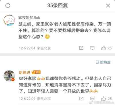 一是胡锡进的老粉在胡锡进的微博评论区询问,“家里80岁老人被阳性邻居传染,万一顶不住,算谁的?”
