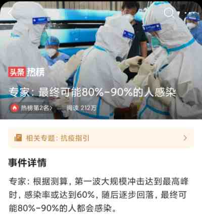 三是“专家:最终可能80%-90%的人感染”的报道冲上了头条热榜第二: