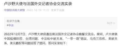 中国驻法大使馆于12月14日发布了一篇文章《卢沙野大使与法国外交记者协会交流实录》。