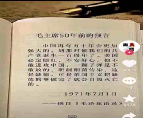 1、标题与落款时间矛盾。从截图看,预言标题是“毛主席50年前的预言”,落款是“1971年7月1日”“摘自《毛泽东语录》”。如果标题是真的,1971-50=1921,难道这是1921年时的预言?感觉“毛主席50年前的预言”这个标题与下面内容相互矛盾,属画蛇添足、欲盖弥彰之举。