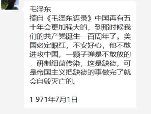 近期,微信群中,发现有人发出文字或图片,显示是毛主席语录或者毛主席的预言。截图如下:
