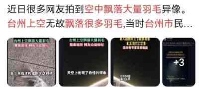 12月20日有伙伴私信策辩,“浙江台州羽毛了,是不是疑似投毒?”说实话个人对此有些怀疑?问“有图有视频没?”其推荐策辩搜索浙江台州社交媒体,一查真有社交媒体发视频,天空中飘荡这羽毛。因不能确定具体情况,想看看有没有官方解释,如是不是当地起大风?是不是羽绒厂仓库意外等?可直至写文没搜到相关解释。