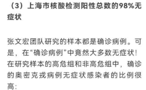 张文宏团队在篡改“无症状感染者”定义的基础上,直接提出了上海市核酸检测阳性总数的98%是无症状感染者,并且将无症状感染者与确诊病例单独分开来,给人造成一种印象,那就是无症状感染者就等于没事儿,只有确诊者才是真正的感染者。