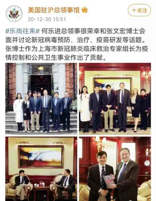 早在2020年的12月份,张文宏就与美国驻沪总领事馆总领事何乐进就新冠病毒预防、治疗和疫苗等话题展开了讨论,我们现在有理由怀疑他们之间是不是有什么不可告人的内幕?