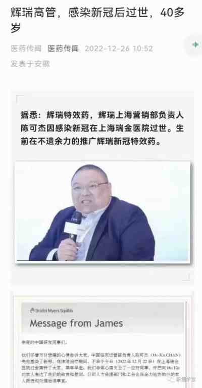 不过呢,对老胡来说,现在推进辉瑞P药有几个难题。第一个难题就是辉瑞P药又吃死人了。今天全网都在争相报道,辉瑞特孝药、辉瑞上海营销部负责人阿可杰因感染了新冠在上海瑞金医院去世了。毫无疑问,作为辉瑞特孝药上海营销部负责人,他肯定是吃了辉瑞特孝药的: