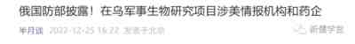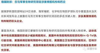 第三、最后一个非常不好的消息,就是俄罗斯国防部昨天公布了,美国辉瑞制药及美国情报部门参与了乌克兰的生物实验室计划,从事生化武器的研究,包括辉瑞制药公司国际研发与医学部总裁及首席研究员等等。