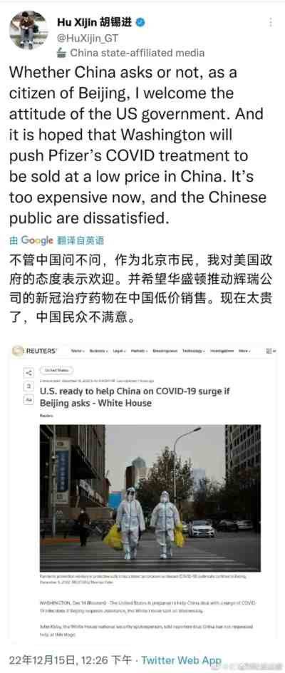 老胡能量巨大,在中国互联网上一向都是一呼百应,但是这一次在美国推特上跪求洋药,洋大人似乎一点也不给面子。我看了一下,辉瑞出口到中国的药,价格并没有因为老胡的呼喊就降价了。反而因为进了医保,在许多医院里面,还要加收600到1000多的问诊费之类的。
