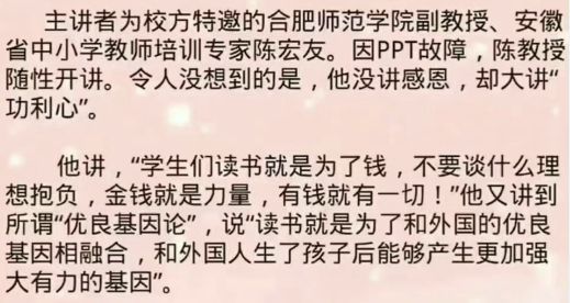 可在一场励志演讲中,台下坐着成百上千的学生,公然宣传错误的“杂交基因优势论”,这是对教职的侮辱,不配为人师。