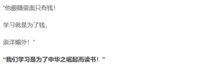 很多人说孩子单纯不成熟,没有经历过社会的毒打,这些人依然还是老论调,把成为一个精致的利己主义者视为一种成熟。为国家民族的前途命运而奋斗,做出成绩来难道会没有钱吗?赚钱是把事情做成功之后的结果,赚钱不应该成为评判是否成功的原因。
