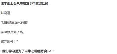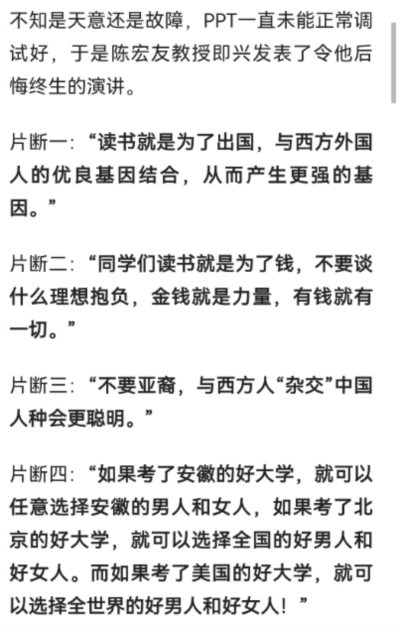 陈宏友在庐江中学的演讲成为了他人生的滑铁卢,那么他究竟讲了一些什么,让庐江中学的师生如此愤怒呢?知情人士爆出了陈叫兽当时的部分演讲内容。