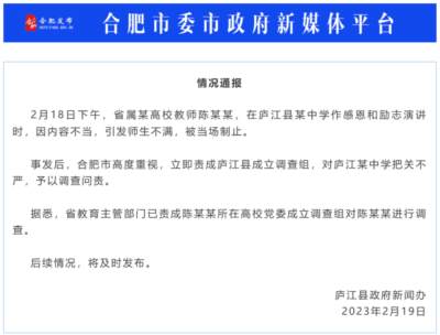 这件事在网上迅速传播,当地迅速行动,按照学校的要求,陈宏友已经停课在家反省。根据合肥发布的最新通告,上级已经责成高校党委对陈进行调查。