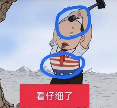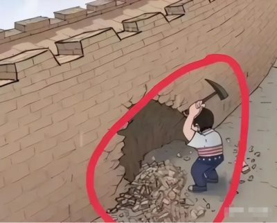 还有穿着美国国旗的小男孩抄起锄头挖长城的墙角: